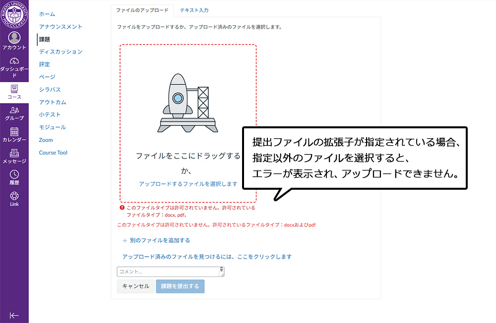 提出ファイルの拡張子が指定されている場合、指定以外のファイルを選択すると、エラーが表示され、アップロードできません。