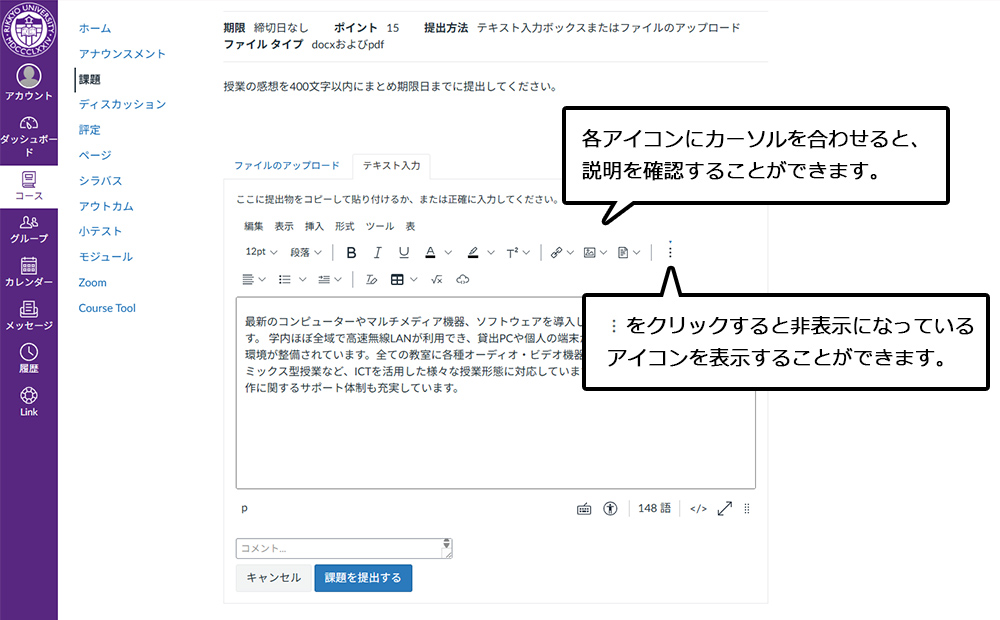 課題の提出画面が表示されます。 提出形式が複数設定されている場合、タブから選択できます。