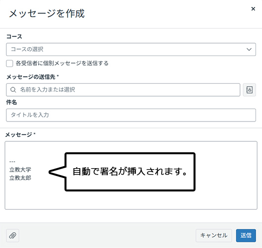 メッセージ作成時に本文に自動で挿入される署名を設定することができます。